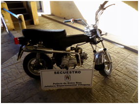 La denuncia fue radicada en horas del mediodía por una mujer de 28 años de edad en la Sección Robos y Hurtos; momento en que persona-s desconocida-s le sustrajeron desde un estacionamiento de la vía pública, ubicado en calle Urquiza y Moreno, un motovehículo Guerrero GT 70cc, a raíz de tareas investigativas, y rápido accionar, llevado a cabo por personal de Comando Radioeléctrico se logró dar con el paradero del rodado, el cual fue puesto a disposición de las autoridades judiciales en turno quienes ordenaron el formal secuestro y posterior entrega a su propietaria.-