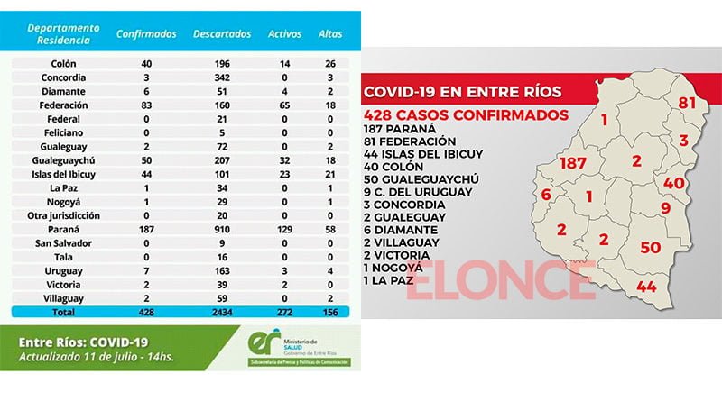 De acuerdo a los datos reportados al 11 de julio de 2020 por el área de Vigilancia Epidemiológica del Ministerio de Salud, en Entre Ríos se han sumado 31 nuevos casos de Coronavirus.