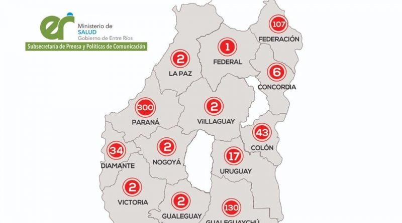 Otros 5 casos fueron detectados en Gualeguaychú, 4 están relacionados a casos ya confirmados previamente y 1 posee antecedente de viaje a provincia con transmisión comunitaria (Buenos Aires).
