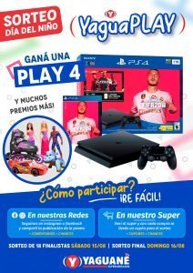 Promo Día Del Niño, arranca mañana viernes 31 de Julio y finaliza el domingo 16 de Agosto (el día del niño). En estas dos semanas de promo YaguaPLAY, muy intensas pueden participar. El premio principal es una Play 4 y hay muchos premios más. Se participa con cupones por compras y a través del Facebook e Instagram.