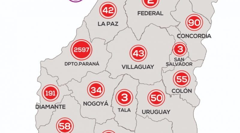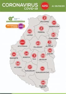 De acuerdo a los datos reportados al 6 de Septiembre de 2020 por el área de Vigilancia Epidemiológica del Ministerio de Salud, en Entre Ríos se han sumado 92 casos de Coronavirus que se distribuyen departamentalmente de la siguiente manera: