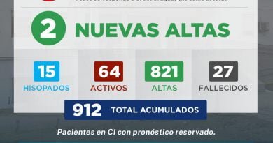 Informa la recepción de 12 resultados de los cuáles 10 son positivos para COVID-19 (7 con nexo, 3 en investigación), de los mismos1 corresponde a un paciente de la localidad vecina de Las Moscas, departamento Uruguay el cuál se le asigna a ésta. 2 negativos.