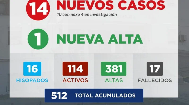 Informa que se suman 14 nuevos casos positivos de Covid-19 (10 con nexo 4 en investigación).