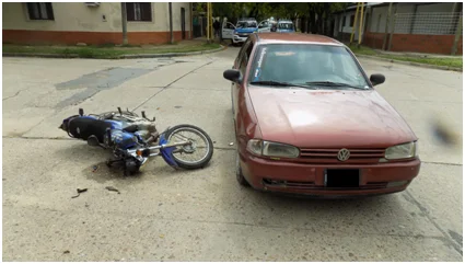 Por razones que se tratan de establecer colisionaron un vehículo marca Volkswagen Gol conducido por un hombre de 37 años de edad, que circulaba por calle Bolívar de Norte a Sur, y una moto marca Yamaha 125 cc conducida por una mujer de 30 años y circulaba de Este a Oeste por calle Perón.