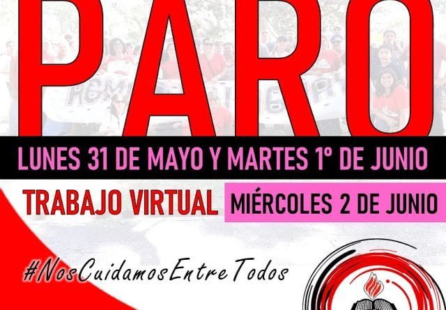 – Realizar PARO los días lunes 31 de mayo y martes 01 de junio, ad referéndum del Congreso que se llevará a cabo el día miércoles 2 de junio, como medida preventiva y de cuidado de nuestra salud demandando: La continuidad del trabajo escolar en forma virtual en el ámbito provincial y cronograma concreto de vacunación para las y los trabajadores de la educación y del personal no docente.