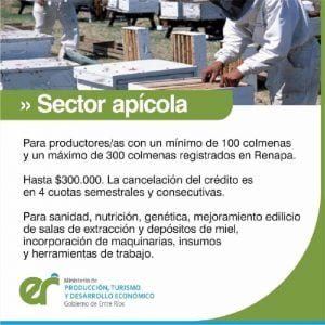 Dirigido a Productores apícolas con un mínimo de 100 colmenas y un máximo de 300 colmenas registrados en RENAPA. Hasta $300.000. La Cancelación del crédito es 4 cuotas semestrales y consecutivas.