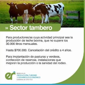 Dirigido a Productores cuya Actividad Principal sea la PRODUCCIÓN DE LECHE BOVINA, y que su producción no supere los 30.000 litros mensuales. Hasta $700.000. Cancelación del crédito a 4 años.