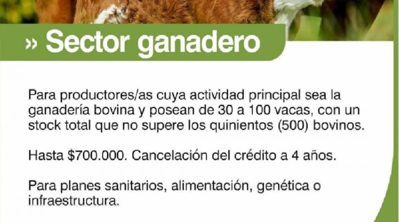 Dirigido a productores cuya Actividad Principal sea la Ganadería Bovina, que posean de 30 a 100 vacas y un stock total que no supere los quinientos (500) bovinos. Hasta $700.000. Cancelación del crédito a 4 años.