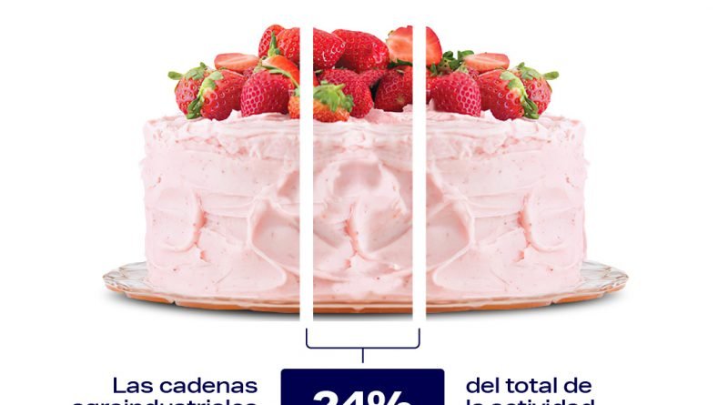 En ese porcentaje se incluye la producción primaria, industrial y servicios (comercio, transporte y logística, servicios conexos). Este aporte del 24% que generan las cadenas agroindustriales se reparten entre servicios conexos (9%), productos primarios (8%) y agroindustria (7%).