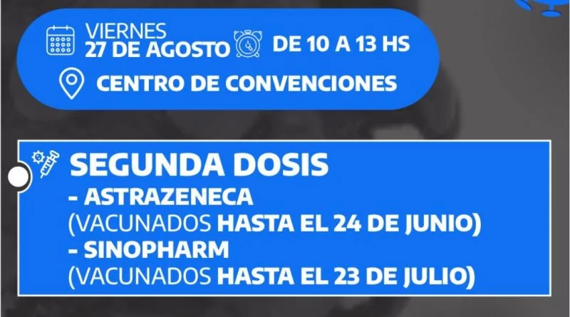 En la continuidad del desarrollo del Plan Rector de Vacunación dispuesto por el Gobierno de Entre Ríos e implementado en nuestra ciudad por la Municipalidad de Villaguay a través de la Dirección de Salud y el Hospital Santa Rosa, mañana viernes 27, se estará realizando una nueva jornada abierta (sin turnos previos) de vacunación con segundas dosis, destinadas a dos grupos específicos: