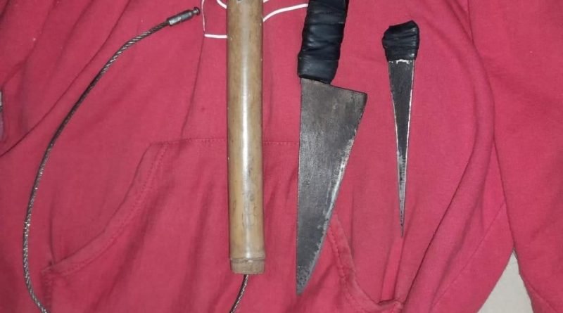 A raíz del hecho se procede a realizar una minuciosa búsqueda de materiales de interés, como resultado se llevo a cabo el formal secuestro de un elemento metálico corto punzante de fabricación casera tipo cuchillo, hoja metálica y mango recubierto con goma color negra; un segundo elemento metálico, filoso corto punzante, de fabricación casera, base recubierta con goma color negra; y un trozo de caña, que cuenta con una piola multifilamentos, en la parte trasera como medida de seguridad, mientras que en el otro extremo un cable de acero multifilamentos, con plomo en la apunta; además, se constató la presencia de 75 plantines de especie cannabis sativa (marihuana), distribuidas en el patio dentro de planteras y una huerta las cuales arrojaron un pesaje de 34 gramos. Por lo que se dio intervención a personal de la División Toxicología de la Jefatura Departamental Villaguay, quienes procedieron a realizar el formal secuestro por orden de la Fiscal en turno.