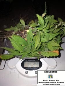 A raíz del hecho se procede a realizar una minuciosa búsqueda de materiales de interés, como resultado se llevo a cabo el formal secuestro de un elemento metálico corto punzante de fabricación casera tipo cuchillo, hoja metálica y mango recubierto con goma color negra; un segundo elemento metálico, filoso corto punzante, de fabricación casera, base recubierta con goma color negra; y un trozo de caña, que cuenta con una piola multifilamentos, en la parte trasera como medida de seguridad, mientras que en el otro extremo un cable de acero multifilamentos, con plomo en la apunta; además, se constató la presencia de 75 plantines de especie cannabis sativa (marihuana), distribuidas en el patio dentro de planteras y una huerta las cuales arrojaron un pesaje de 34 gramos. Por lo que se dio intervención a personal de la División Toxicología de la Jefatura Departamental Villaguay, quienes procedieron a realizar el formal secuestro por orden de la Fiscal en turno.