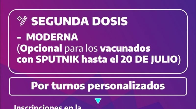 La Dirección Municipal de Salud informa que continúan inscribiendo para asignar turnos personalizados a los villaguayenses que recibieron la primera aplicación de la vacuna Sputnik contra el Covid-19, y opten en forma voluntaria por la inoculación de segunda dosis con el componente Moderna, habiendo transcurrido 90 o más días desde la fecha inicial.
