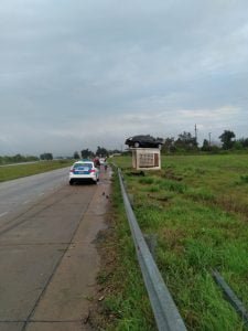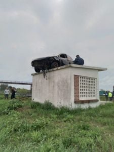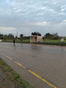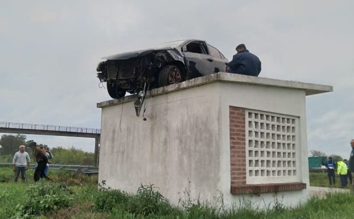 En la lluviosa mañana de este lunes se produjo el despiste de un vehículo en la Autovía Ruta Nacional 14, km 148, zona de Colonia Hugues. El auto terminó su marcha sobre el techo de una garita. Era conducido por un policía. (Ampliaremos).-