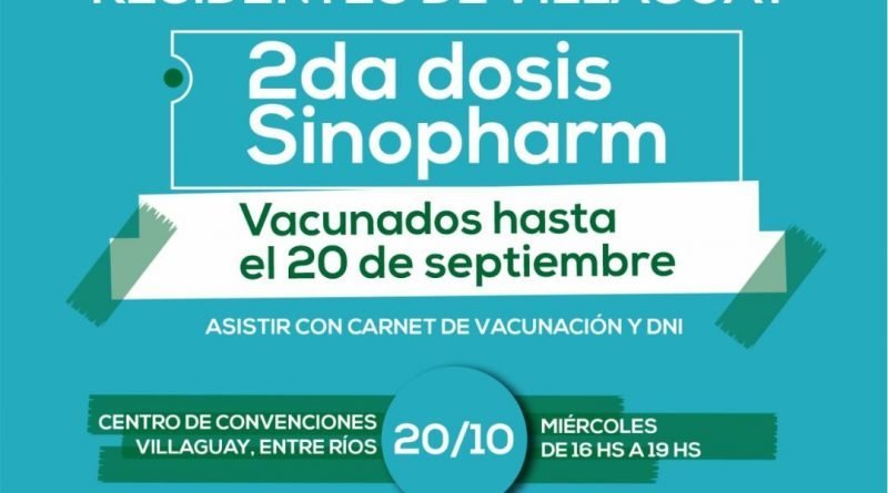 La Municipalidad de Villaguay informa que en la continuidad del Plan Rector de Vacunación contra el Covid-19, mañana de 16 a 19 hs en el Centro de Convenciones se llevará adelante la aplicación de segundas dosis.
