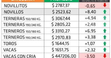 En tanto, las retracciones de las ventas a los restantes principales destinos compensaron totalmente estas subas, destacándose los casos de Israel (-16,8%; -951 tn pp), Chile (- 35,0%; -795 tn pp), y detrás el de Brasil (-27,7%; -160 tn pp). Debemos tener presente que la faena para envíos a Israel aún no se normalizó totalmente, luego del receso de por el año nuevo en ese país.