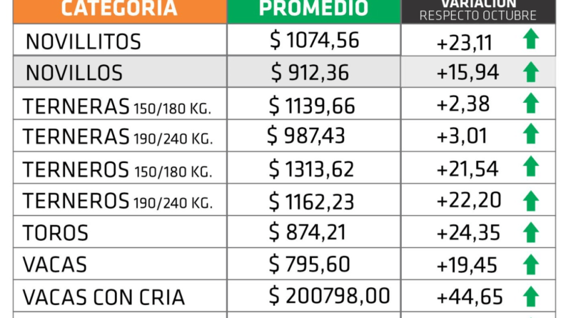 En síntesis, los precios promedios que arrojaron los remates en la provincia de Entre Ríos en el mes de noviembre de 2023 fueron los siguientes: