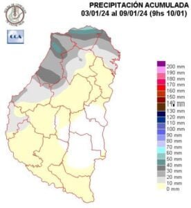 Como podemos ver en el mapa, hay una muy extendida franja del territorio provincial que recibió precipitaciones por encima de los ochenta milímetros. La extensa red de estaciones y los datos de los colaboradores de la BCER, permiten detectar las zonas donde las lluvias fueron más abundantes. Las mismas quedaron contenidas dentro de esta franja con piso de ochenta milímetros. Se destacan varios máximos distribuidos en forma inconexa, con acumulados superiores a los ciento treinta milímetros. También podemos reconocer en el mapa una menor oferta de agua hacia el sudeste y hacia el norte provincial. En el norte ya venía lloviendo en las semanas previas, pero hay zonas de Gualeguaychú que han quedado un poco rezagadas en los acumulados pluviales. En este sentido, el sudeste de la provincia queda algo más necesitado en