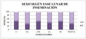 Con respecto a los nacimientos, se observó que cuando la concepción o inseminación se da durante la fase de luna menguante, aumenta la proporción de hembras y los partos tienden a ser más fáciles, con un menor peso al nacer. En contraste, el número total de nacimientos aumenta durante la fase creciente.