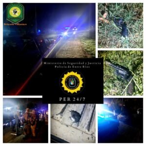 En horas de la noche de este miércoles 14 de febrero momentos en que personal de la Dirección de Prevención de Delitos Rurales realizaba operativo rutinario en Boulevard Mosconi y Santa Rosa, más precisamente detrás de la Escuela de Agentes de Policía, personal perteneciente a la Seccional de la Brigada Abigeato Villaguay detienen la marcha de un automóvil marca Chevrolet modelo Corsa, el cual de manera repentina intenta colisionar a los uniformados, emprendiendo fuga; a raíz de lo sucedido se realiza una persecución por más de veinte cuadras en la ciudad, siendo alcanzados en la intersección de calles Echaniz y Estrada contando con la colaboración de móviles de la Sección Comando Radioeléctrico, se detiene a dos personas quienes arrojan un envoltorio y dos armas de fuego tipo revólver .38 y .22; se le dio intervención a la División Toxicología realizando tareas de campo, resultando el envoltorio arrojado con un pesaje de 8,54 gramos de Cocaína. Se procedió a identificar a los ciudadanos oriundos de la ciudad de Paraná, de 33 y 42 años de edad respectivamente, al momento de realizar el palpado superficial sobre sus prendas se detecta otro envoltorio de Cocaína arrojando un peso de 9,34 gramos; en cuanto al vehículo se realizó el formal secuestro del mismo.