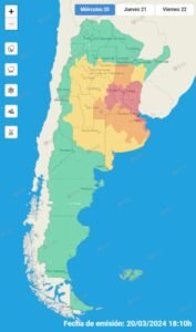 Defensa Civil Entre Rios informa en los Departamentos Gualeguay – Victoria, Colón – Gualeguaychú – Islas del Ibicuy – Tala – Uruguay-Diamante – La Paz – Nogoyá – Paraná – Villaguay-Concordia – Federación – Federal – Feliciano – San Salvador La presencia de una masa de aire húmedo, potencialmente muy inestable, donde ya se organizaron tormentas severas en sectores de la provincia de Buenos Aires, se espera que avance un importante frente frío que se moverá desde el norte de la Patagonia hasta el norte del litoral en las próximas 24 a 36 hs. En su pasaje se desarrollarán tormentas fuertes o severas, las mismas estarán acompañadas principalmente por caída de granizo, muy fuerte actividad eléctrica, ráfagas intensas que podrían superar los 90km/h, y abundante caída de agua en cortos períodos. Se estiman valores de precipitación acumulada entre 80 y 100 mm, pudiendo ser superados en forma puntual y que se sumarán a las ya ocurridas en las ultimas horas.