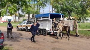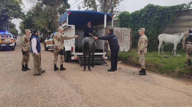 Este Martes por la mañana personal de la Dirección de Veterinaria Municipal Gualeguaychú, con la valiosa colaboración del personal policial de la “Brigada de Prevención Delitos Rurales”, quienes utilizando un carrilin perteneciente a la sección Montada, pudieron realizar el secuestro de tres (03) equinos, que se encontraban sueltos en la vía pública, dos de ellos se constataron en calle Corrientes y Jujuy, donde una yegua deambulaba junto a su potrillo, y posteriormente sobre calle Irazusta y Camilo Villagra, de dónde se localizó el tercer animal, debido a que estos representaban un inminente peligro para los transeúntes y automovilistas que circulaban por el lugar; los mismos fueron trasladados a un predio a disposición de las autoridades Municipales, ya que no se pudo localizar en primer momento a los propietarios de estos semovientes.