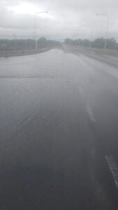 Ruta Nº 6, zona puente El Tigre agua sobre la ruta y banquina blanda,