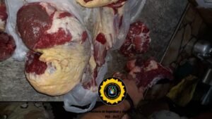 El primer allanamiento se realizó en una finca ubicada en calle Belgrano de Ibicuy, lugar donde los uniformados localizaron quince (15) Kg de carne bovina con restos de pelo negro, arena y tierra, un hueso de animal bovino con restos de carne correspondientes a la paleta del animal, entre otros elementos de interés para la causa, como prendas de vestir, y cuchillos.