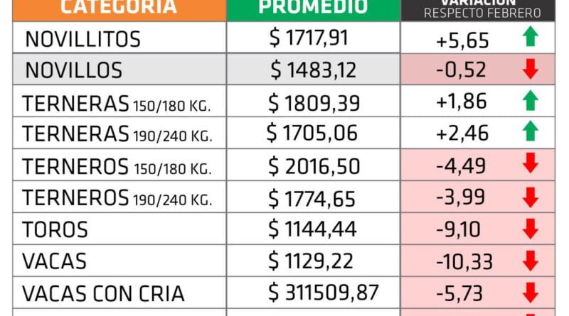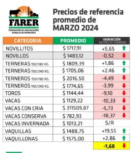 En síntesis, los precios promedios que arrojaron los remates en la provincia de Entre Ríos en el mes de marzo de 2024 fueron los siguientes: