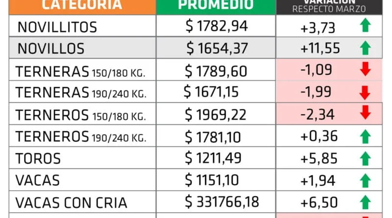 No obstante, y más allá de no haber sido un buen mes en el global, la mayoría de las categorías aumentaron sus precios respecto de marzo. Las que más crecieron fueron las vaquillas (+ 13,05%); los novillos (+ 11,55%) y las vaquillonas (+ 6,56%). En tanto a la baja se mostraron casi todas las variantes de terneros y terneras y las vacas de conserva.