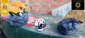 Diligencia que arrojo resultado positivo, luego de una minuciosa búsqueda se procedió al formal secuestro de una bolsa la cual había sido arrojada a una finca lindante (vecina) conteniendo en su interior un buzo de color negro, un buzo con capucha color negro tipo canguro, un buzo tipo canguro con capucha, una campera con capucha color negra, un pantalón joggins, una mochila color negra, una cartera tipo morral de color negro, una cartera de color rosa, una cartera tipo billetera de color roja, una billetera de color negra, una billetera de color piel, un pantalón de jeans, una campera con capucha de peluche color amarillo, un buzo con capucha multicolores, un par de zapatillas, unas zapatillas de color negro.