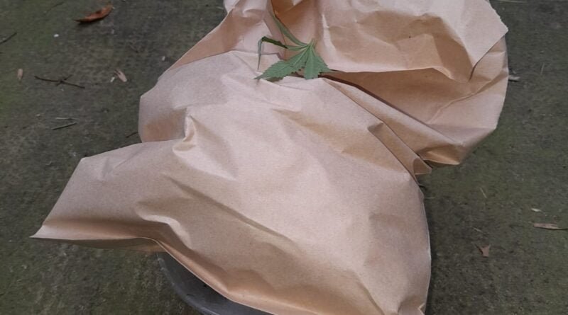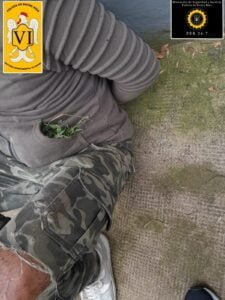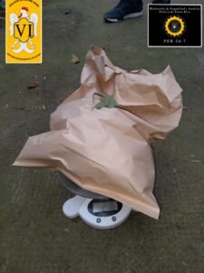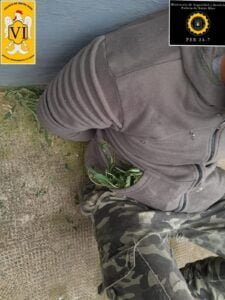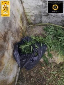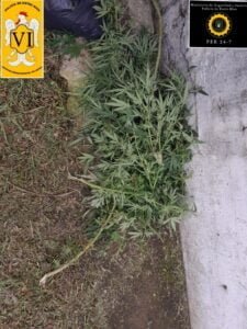 Presentes en la vivienda indicada, ubicada en zona céntrica de la ciudad, se observa un hombre con vestimentas coincidentes a las descriptas, el cual salía desde un pasillo que da acceso a unos departamentos; al momento de realizarle el palpado se le encuentra en los bolsillos hojas similares a las de planta cannabis sativa (Marihuana), por lo que se procedió a realizar una breve recorrida alrededores, donde se logra divisar una bolsa de nylon color negro conteniendo en su interior abundantes hojas y plantas posiblemente de cannabis sativa.