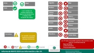 Campos Carles señaló que respecto del semáforo anterior (de marzo, publicado en abril) “se agregaron en abril la carne bovina y la yerba que no estaban en rojo. Mientras que maní, arroz y aves, lograron manterse en verde.