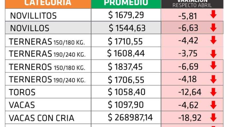 De este modo, todas las categorías bajaron sus precios respecto de abril, algunas de cuales tuvieron una merma muy significativa. Las que más cayeron fueron las vacas con cría, que se derrumbaron 18,92%; seguidas por los toros (- 12,64%); vaquillas (- 9,96%); vacas de invernada (- 9,84%); terneros entre 150 y 180 kilos (- 6,69%). En tanto, las categorías de consumo siguen sin recuperar terreno y retrocedieron 6,63% los novillos y un 5,81% los novillitos.