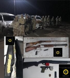 En otro procedimiento llevado a cabo sobre Arroyo La Mionngs el viernes 21, controlaron una embarcación tripulada por tres masculinos, mayores de edad, los que transportaban 2 Escopetas calibre 12/70 y 1 Pistola calibre 9mm, careciendo de documentación como también Permiso de Caza, por cuanto incautaron tales armas de fuego conforme las disposiciones del articulo 189º bis del C.P.A..