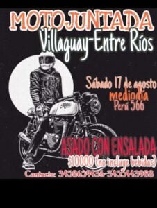 En este sentido, aprovechando el feriado del sábado, se ha convocado a una actividad motera con asado y caravana hacia el centro de Villaguay. Se invita a todos los amantes de las motos y la amistad a sumarse y participar. Comienza a las 12 horas.