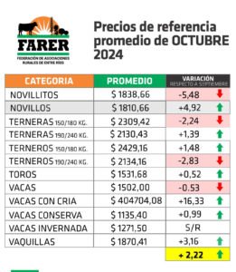 En resumen, los precios promedios que se desprenden de los remates en la provincia de Entre Ríos durante octubre son los siguientes: