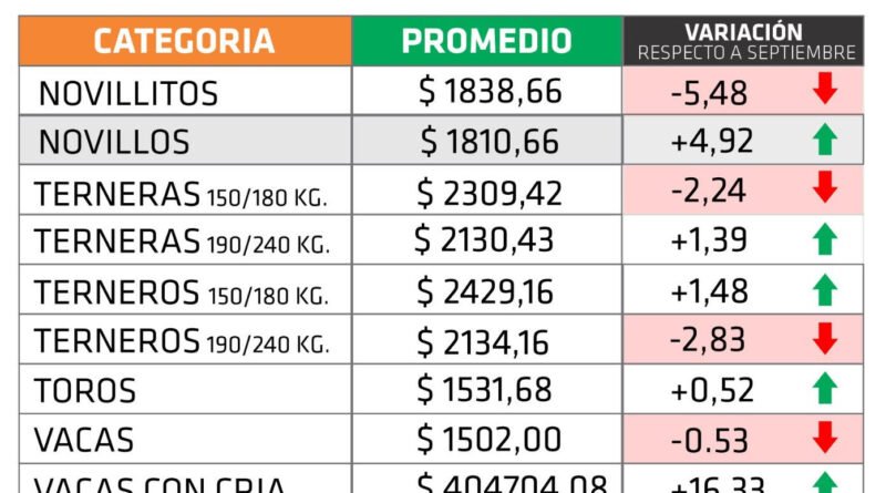 En resumen, los precios promedios que se desprenden de los remates en la provincia de Entre Ríos durante octubre son los siguientes: