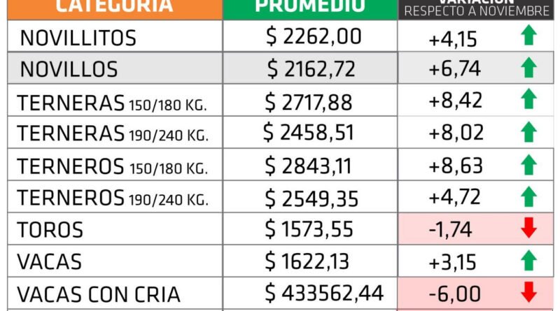 En resumen, los precios promedios que se desprenden de los remates en la provincia de Entre Ríos durante diciembre fueron los siguientes:
