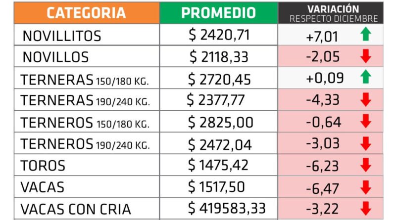 En resumen, los precios promedios que se desprenden de los remates en la provincia de Entre Ríos durante enero fueron los siguientes: