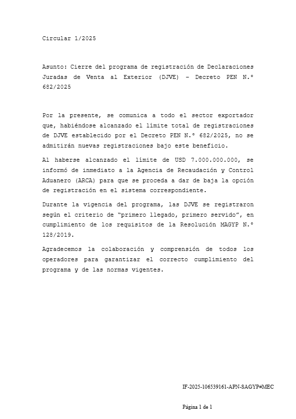 Puntualmente, a través de un breve comunicado en su red social X, Arca informó que “se ha alcanzado la registración del cupo de siete mil millones de dólares previsto por el decreto 682/2025, por lo que se ha dado de baja la opción de registración de las Declaraciones Juradas de Venta al Exterior (DJVE) que se encuentren amparadas por el beneficio del citado decreto”.