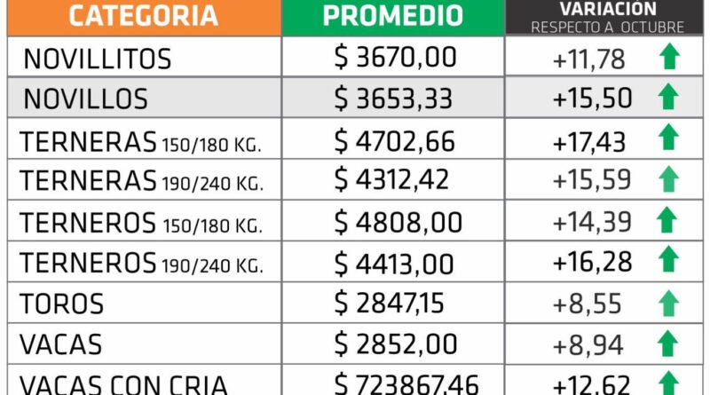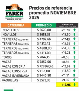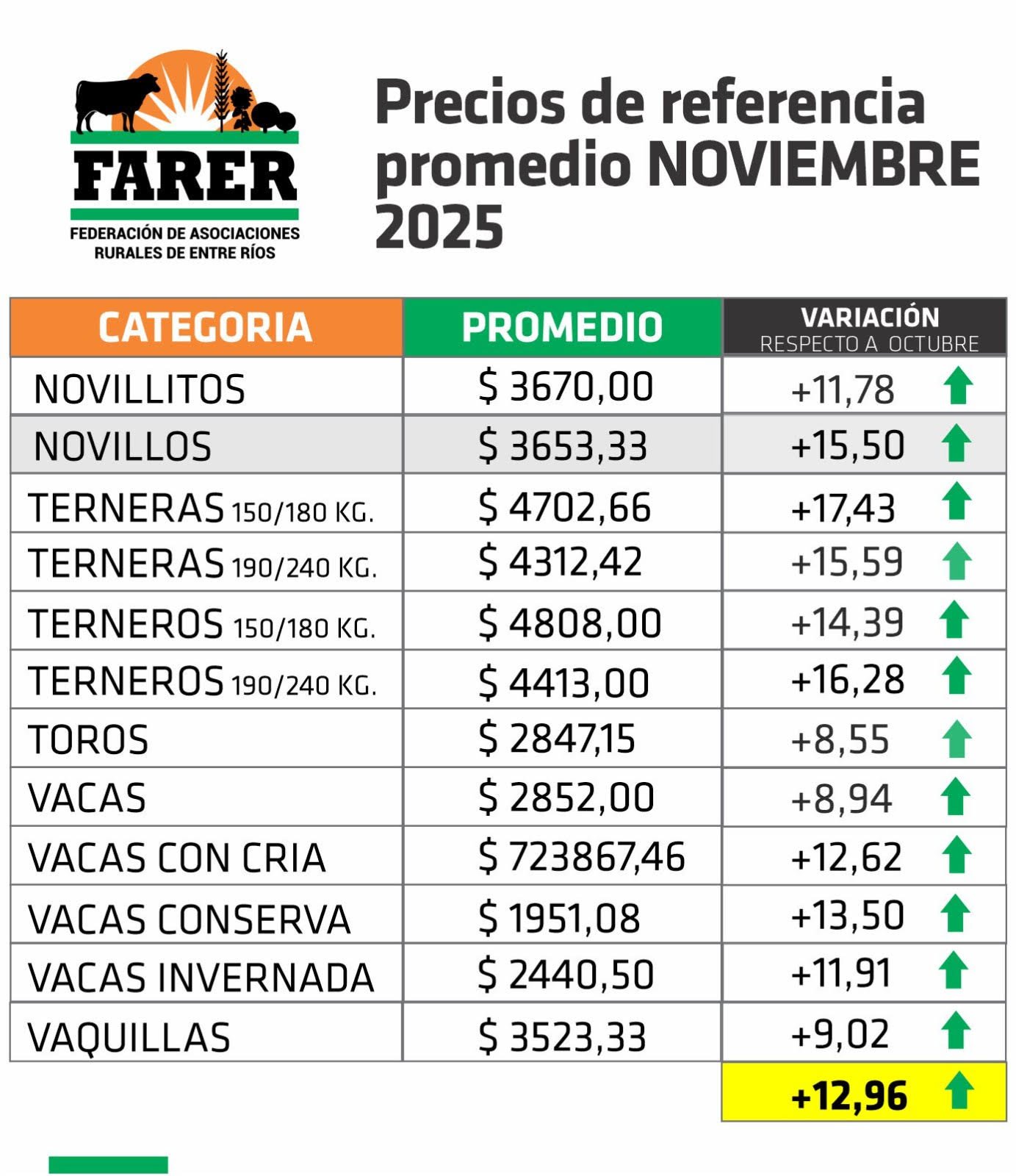 La Federación de Asociaciones Rurales de Entre Ríos (FARER) publicó su relevamiento mensual de precios de hacienda en pie correspondiente a noviembre, elaborado a partir de los valores registrados en los remates realizados por las rurales entrerrianas. Según el informe, el mercado ganadero provincial experimentó un incremento promedio del 12,96% respecto de octubre, con un desempeño destacado en las categorías de invernada, que fueron las grandes protagonistas del mes.