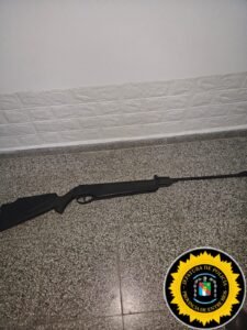 Continuando con las tareas investigativas, personal policial se hizo presente en un domicilio ubicado en la zona Oeste, donde se entrevistó al propietario de la finca manifestó ser padre del joven acompañante quien también tiene de 15 años de edad; quien hizo entrega voluntaria de un aire comprimido tipo nitro pistón, calibre 5.5 mm, color negro, procediéndose al formal secuestro del mismo por guardar relación con el presente hecho.