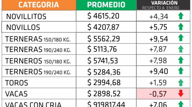 En resumen, los precios promedios que se desprenden de los remates en la provincia de Entre Ríos durante febrero fueron los siguientes: