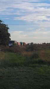 Donde muestran que continúan los problemas de los caminos de la producción en el departamento Villaguay, aquí vemos una colección de camiones a la espera para continuar su viaje, esto se debe a que en unos de los cientos de pantanos esta atascado un camión que impide el paso ya que está enterrado a la espera de que lo puedan remolcar para seguir su destino, estos hecho que se repiten a diario por este tiempo por el deplorable estado de los caminos y mientras continua la ausencia de vialidad para dar alguna mínima solución según los vecinos.